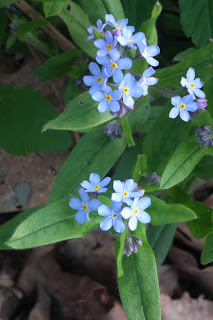 The fiddleheads are here! Even with all the rain and cold temps here in Ohio the fiddlehead ferns have virtually shot out of the ground. Catching them early enough before their fronds open fully is the trick. Though I have seen a recipe or two for sauteing them in orange juice I admit to not having tried this spring treat as of yet. Hmm...could this be the year...I'll get back to you on that one. In the meantime I can see the money plant blossoming here and there. Those blossoms used to be purple, but now all of them are coming in white. It may be time to add a bit of diluted pickle juice to my soil to add a bit of acid to my limey soil. Even the bleeding hearts that are blooming no longer come in pink. They, too, are white. It is always fun to see the blue forget-me-nots fade into mauve as spring progresses. The lungwort has those same two-toned blossoms along with its spotted leaves. I can remember when I first heard about pouring pickle juice onto hydrangeas to make them come in china blue. The thought of deep blue blossoms thrilled me so I immediately poured a whole jar of pickle juice onto the root base of my blue hydrangeas. No one told me to dilute the pickle juice, and I nearly killed my plant! But it survived my ignorance, and by golly, I did have amazingly blue hydrangeas. Note to self...always dilute the pickle juice!